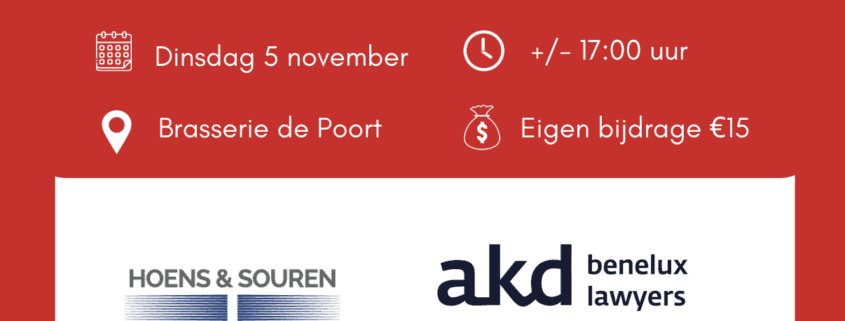 Het recruitmentdiner zal op dinsdag 5 november vanaf 17:00 (aansluitend aan het hoorcollege practicum) plaatsvinden in Brasserie de Poort in Leiden. De eigen bijdrage voor deelname aan dit event is €15,-. Hiervoor krijg je een geheel verzorgd driegangendiner, wijn of andere drankjes, koffie en een unieke kans om jezelf op de kaart te zetten bij de meest vooraanstaande kantoren.