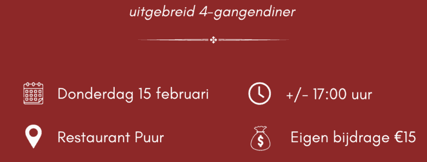 Het recruitmentdiner zal plaatsvinden in restaurant Puur in Leiden. De eigen bijdrage voor deelname aan dit event is €15,-. Hiervoor krijg je een geheel verzorgd viergangendiner, wijn of andere drankjes, koffie en een unieke kans om jezelf op de kaart te zetten bij de meest vooraanstaande kantoren.